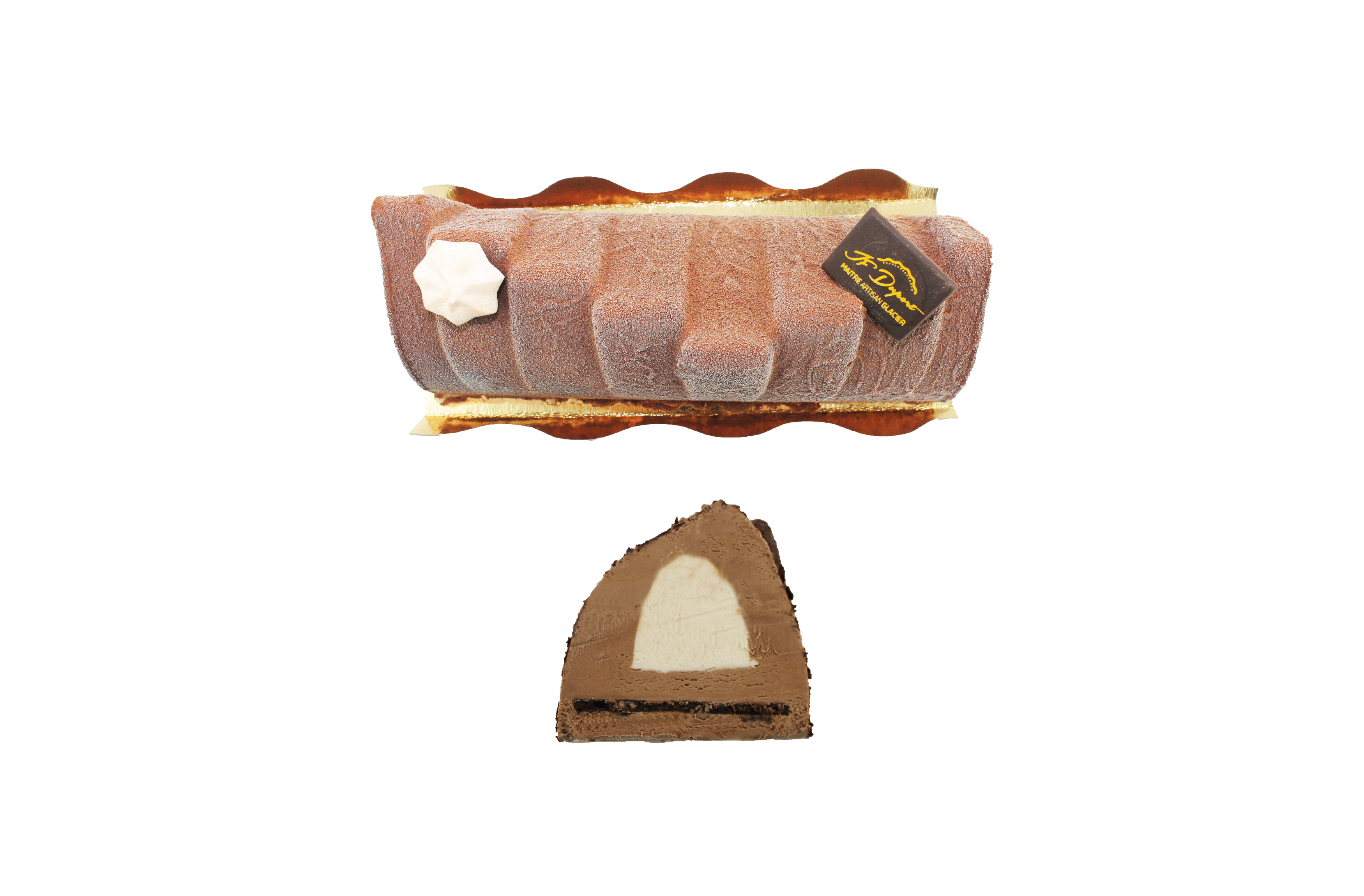 Ingrédients et décor : LAIT entier fermier pasteurisé, sucre, chocolat Saint Domingue 8,8% (beurre de cacao, lécithine de SOJA, arôme naturel de vanille),BEURRE fermier, jaune d'OEUFS, pâte de NOISETTES du piémont 5,05%, LAIT écrémé reconstitué, dextrose, émulsifiant:E471, stabilisants:E407,E412,E466, gaufrettes PRALINE et chocolat 50% ((PRALINE, NOISETTES,AMANDES)biscuit émietté (farine de BLE, extrait de malt(ORGE),poudre à lever:E500ii)). Nappage velour Noir : pâte de cacao, sucre, beurre de cacao, émulsifiant : lécithine de soja, arôme naturel de vanille. Etoile Meringue : Blanc d'OEUF. Plaquette chocolat JFD : Beurre de cacao, pâte de cacao, lécithine de SOJA, extrait de vanille