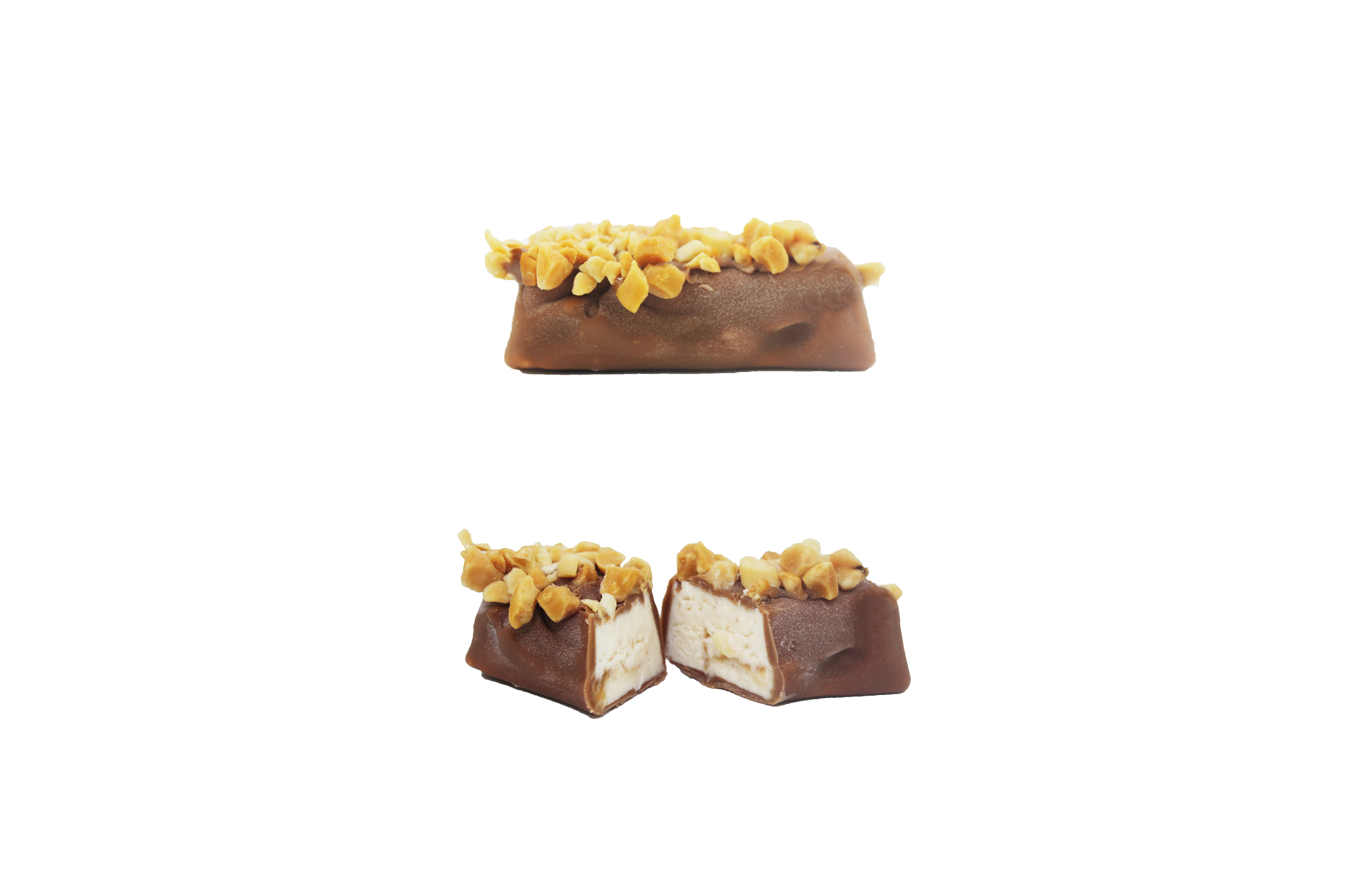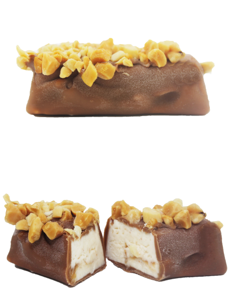 Bouchée glacée Snicky à la crème glacée Cacahuète au bon lait et beurre fermier des Deux Sèvres, sauce Caramel Maison enrobée de chocolat au lait avec brisures de cacahuètes
